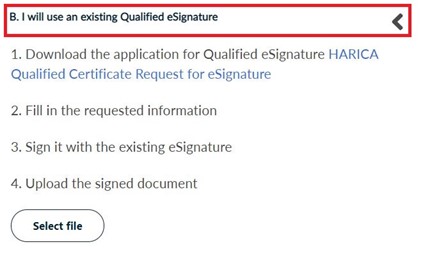 In case you choose method B, fill in and digitally sign HARICA’s request form with an existing qualified eSignature(e.g. eToken, smartcard).