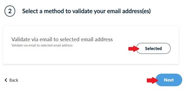 In case you included your email address(es), you have to select one of the following email validation methods to prove you control/own your email address(es). Then, click Next.
