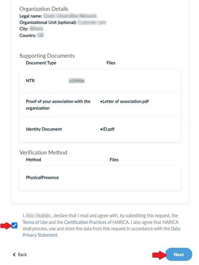 Check to make sure that all of the information is correct, accept the Terms of Use, the Certification Practices of HARICA and the Data Privacy Statement. Then, click Next.