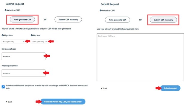 You have the option to generate your CSR in your browser using the auto-generation feature or submit one you have already prepared (e.g. using openssl).