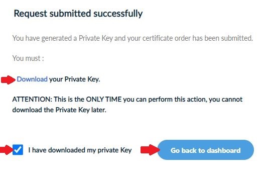 Download your protected private key and then press Go back to dashboard.