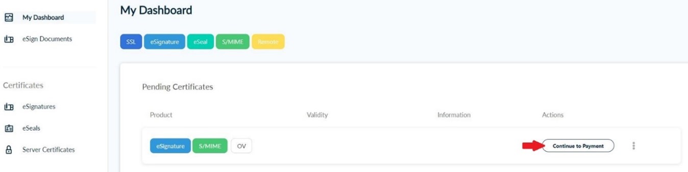 Once all actions have been completed successfully, the next step is to proceed to the payment of your advanced eSignature. To do that, click Continue to Payment.