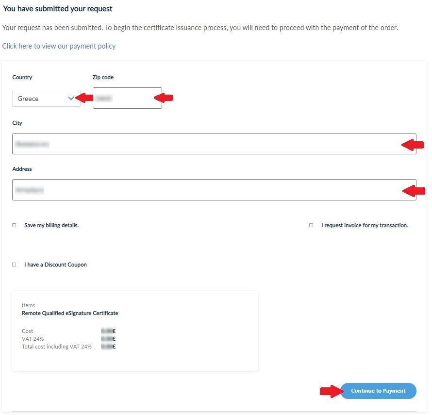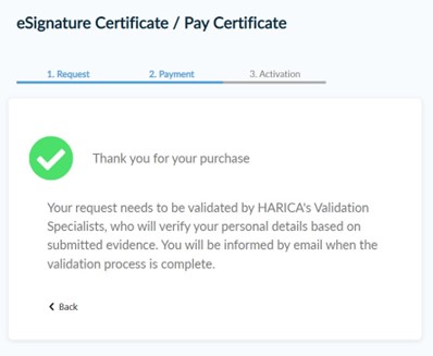 Once the payment is complete, you will be redirected back to HARICA’s CertManager confirming the purchase of your Certificate.