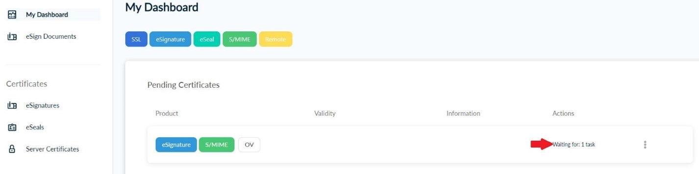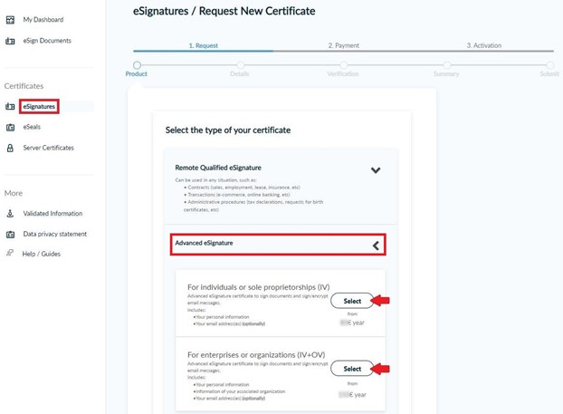 Once you log in, from the side bar, click eSignatures. Then, choose Advanced eSignature and click Select to one of the following certificate types.