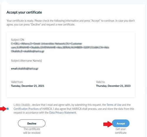 After you check that all of the information is correct, accept the Terms of Use, the Certification Practices of HARICA and the Data Privacy Statement. Then, press Accept.