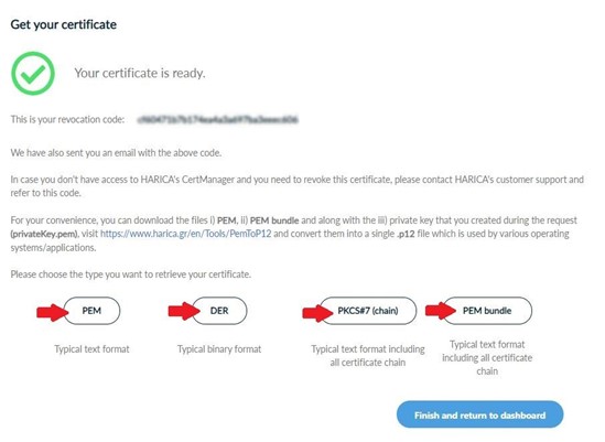 Finally, you can retrieve your certificate in different formats.