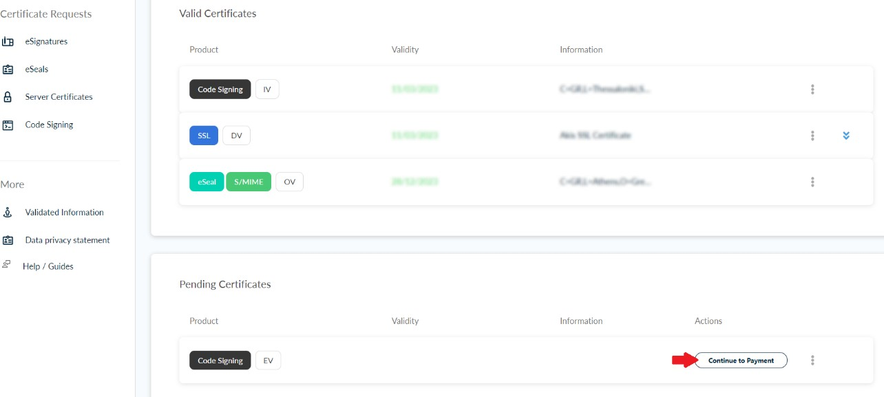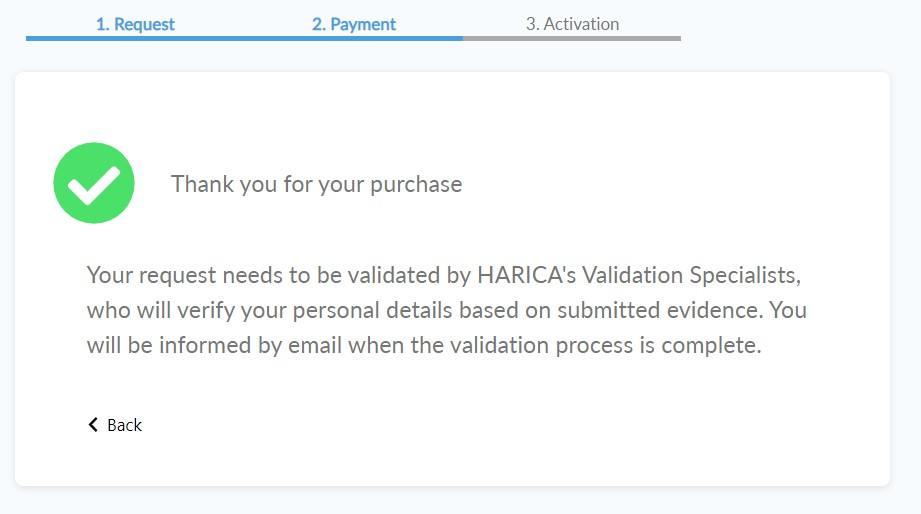 Once the payment is complete, you will be redirected back to HARICA’s CertManager confirming the purchase of your Certificate.