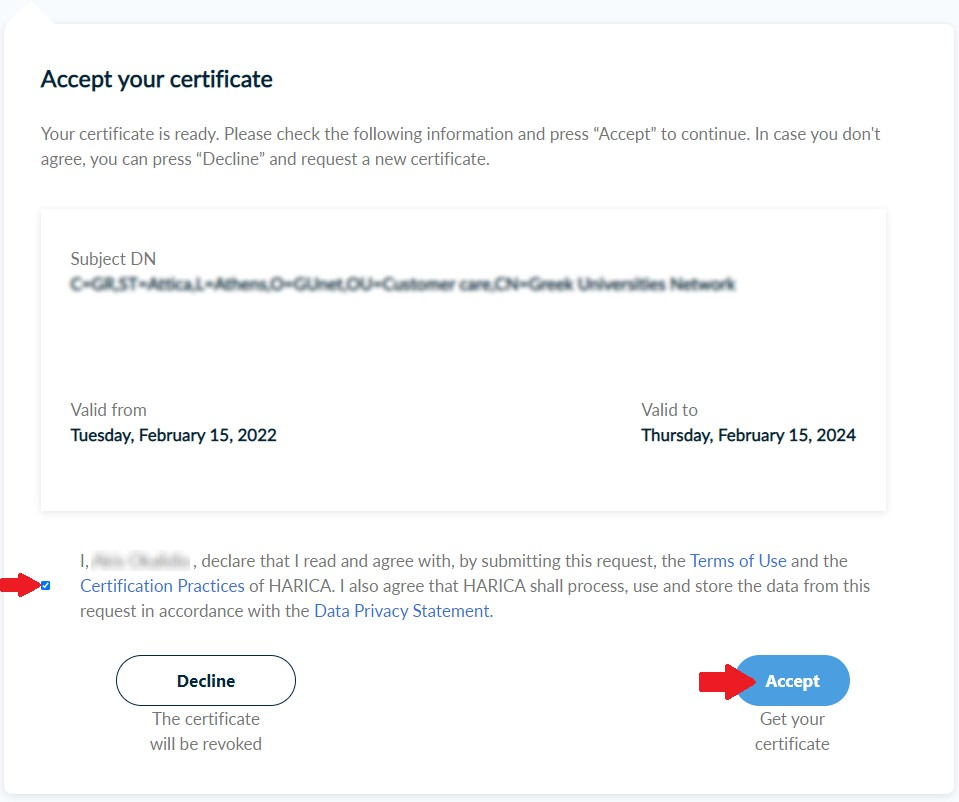 After you check that all of the information is correct, accept the Terms of Use, the Certification Practices of HARICA and the Data Privacy Statement. Then, click Accept.