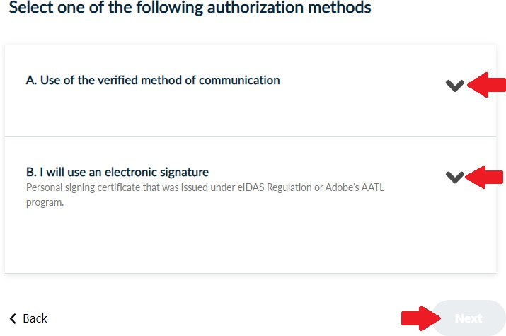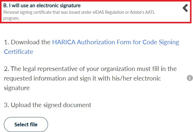 - In case you choose method B, the legal representative of your organization must fill in and digitally sign HARICA’s authorization form with a personal signing certificate.