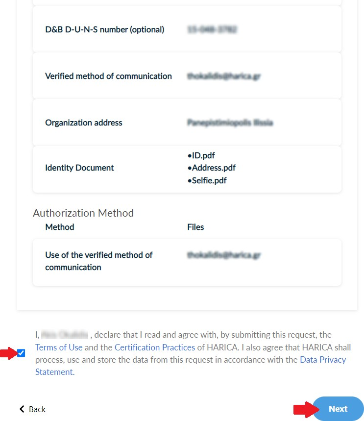 Check to make sure that all of the information is correct, accept the Terms of Use, the Certification Practices of HARICA and the Data Privacy Statement. Then, click Next.
