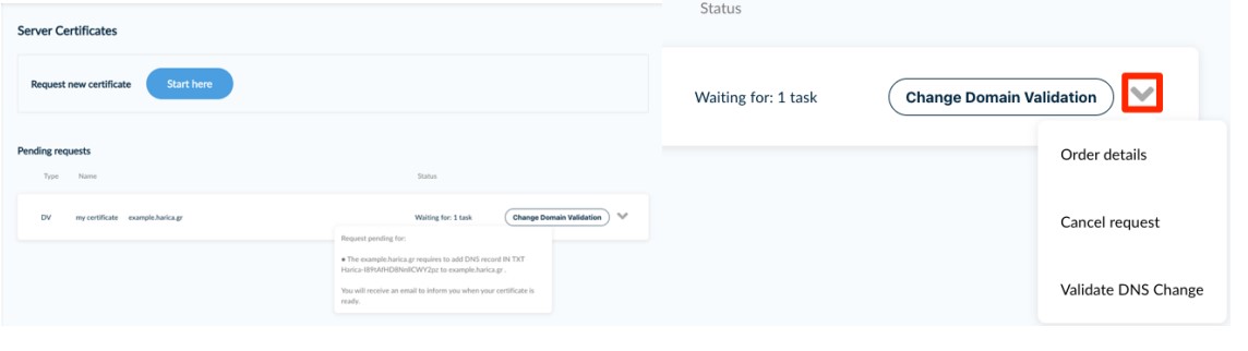 The request is pending until the domain validation is completed. There are some actions available (e.g. cancel your request, speed up HARICA’s check for your DNS/Website changes), by selecting the arrow icon on the right.