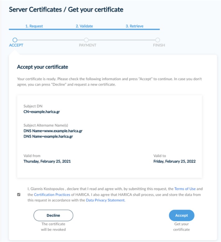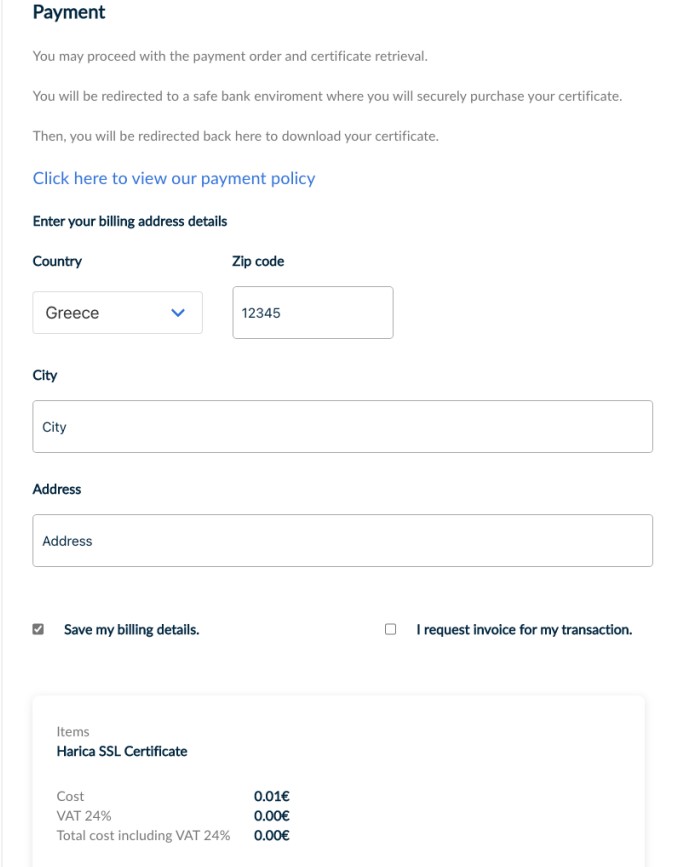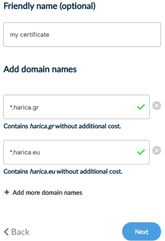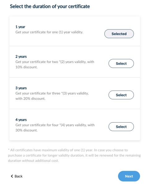 *Please keep in mind that HARICA’s SSL/TLS Certificates have a maximum validity of one (1) year. This limitation is enforced by the CA/Browser Forum and Certificate Consumers (e.g. Apple, Google, Microsoft). Choosing to purchase a certificate for 2, 3, or 4 years means you will get a new certificate for the remaining time without any additional cost. You will receive expiration notifications before each certificate expires.