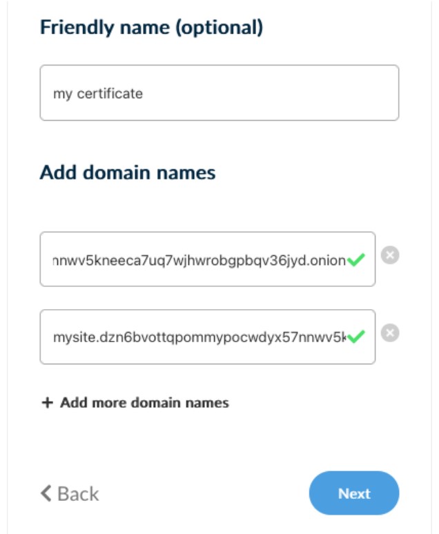 SSL DV Onion (Domain Validated – Onion): SSL/TLS Server Certificate that includes one .v3 RFC 7686 “.onion” special-use Domain Name with up to 10 subdomains. (e.g 4gmrlefxkq4mtan6a2lqwfwa7un4brjlatka75nwdczemqqwn3wznnad.onion, mysite.4gmrlefxkq4mtan6a2lqwfwa7un4brjlatka75nwdczemqqwn3wznnad