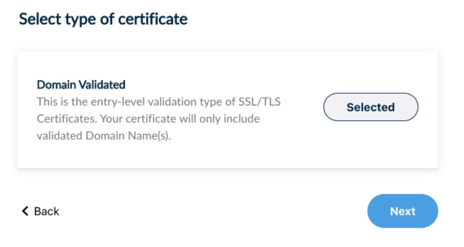 Select the type of your certificate (DV), press “Next”.