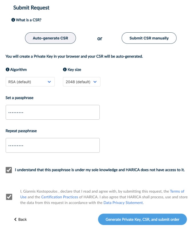 You have the option to generate the private key and the certificate request file (.csr/.req) automatically on your browser or submit your .csr. The “Auto-generate CSR” option requires you to select the key type/size and set a passphrase that you must remember since it will protect the private key of your certificate.