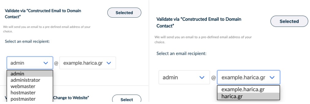Depending on the type of your requested certificate, you have the following options for the domain validation procedure.