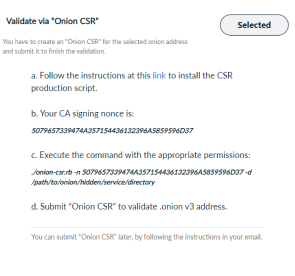 Create a validation “Onion CSR” for the selected onion address and submit it.