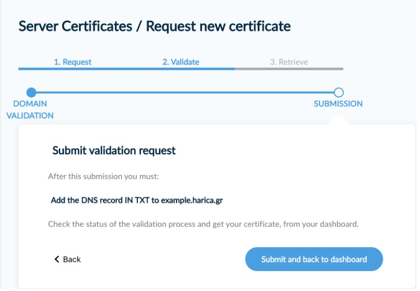 After selecting your preferred domain validation method, press “Submit and back to dashboard”.