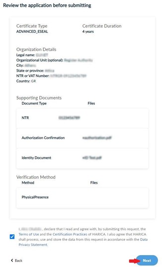 Check to make sure that all of the information is correct, accept the Terms of Use, the Certification Practices of HARICA and the Data Privacy Statement. Then, click Next.