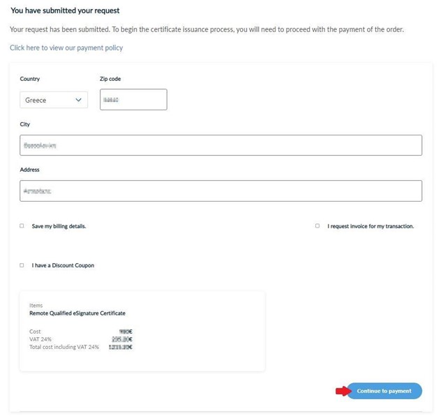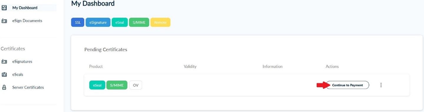 Once all actions have been completed successfully, the next step is to proceed to the payment of your advanced eSeal. To do that, click Continue to Payment.