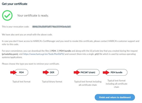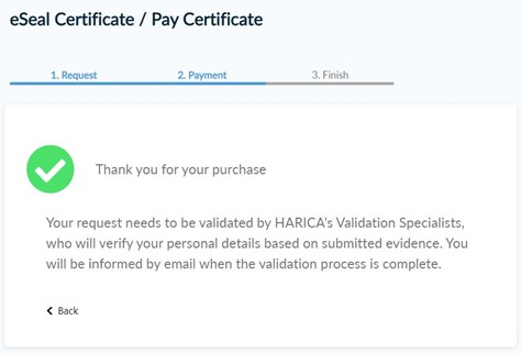 Once the payment is complete, you will be redirected back to HARICA’s CertManager confirming the purchase of your Certificate.