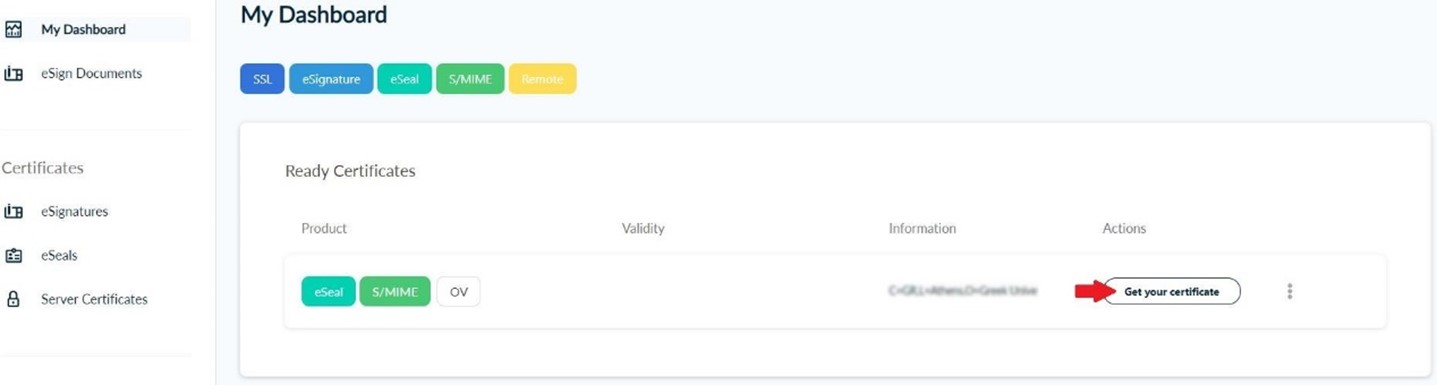 When the validation is completed you can proceed with the certificate acceptance. Press Get your certificate.