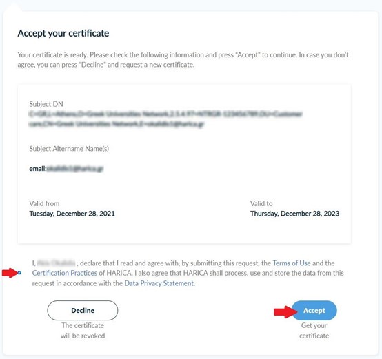 After you check that all of the information is correct, accept the Terms of Use, the Certification Practices of HARICA and the Data Privacy Statement. Then, press Accept.