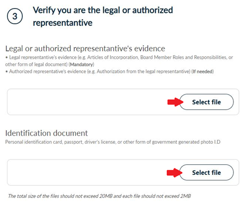 Verify that you are the legal representative of the organization (or a dully-authorized representative) by uploading the required documents. Then, click Next.