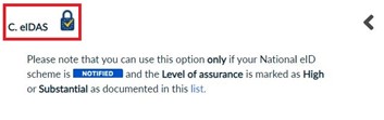 - Choose eIDAS login if your National eID scheme is NOTIFIED and the Level of assurance is marked as High or Substantial as documented in this list.