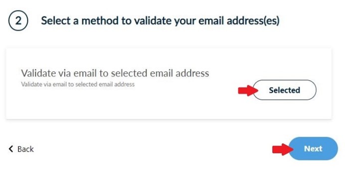 In case you included your email address(es), you have to select one of the following email validation methods to prove you control/own your email address(es). Then, click Next.