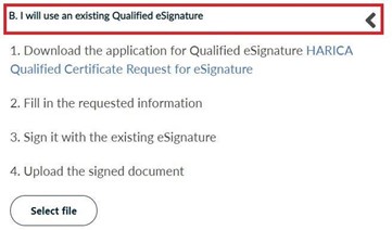 In case you choose method B, fill in and digitally sign HARICA’s request form with an existing qualified eSignature.