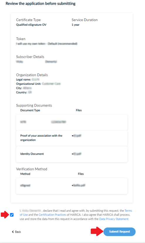 Check to make sure that all of the information is correct, accept the Terms of Use, the Certification Practices of HARICA and the Data Privacy Statement. Then, submit your request.