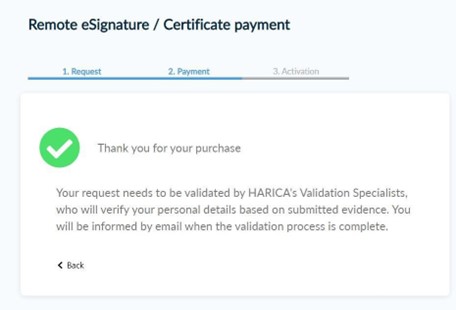 Once the payment is complete, you will be redirected back to HARICA’s CertManager confirming the purchase of your Certificate.