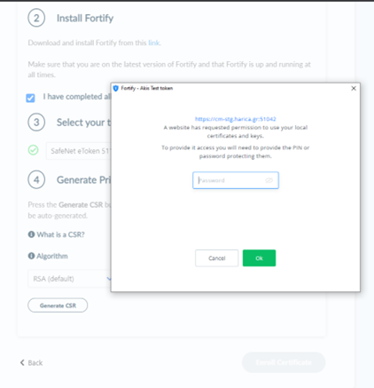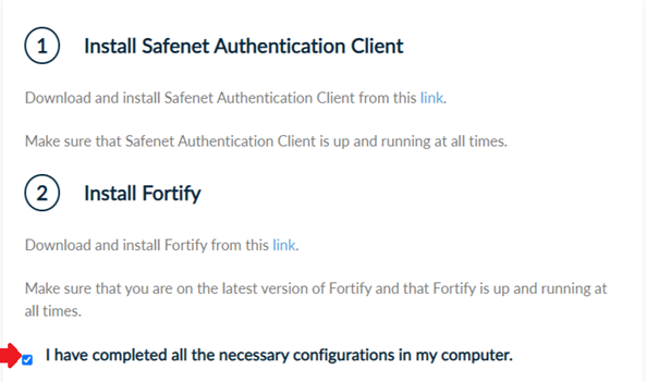 In order to proceed with the enrollment process, you will need to install two software in your computer, Safenet Authentication Client and Fortify. When the installation is complete, check the option I have completed all the necessary configurations in my computer.