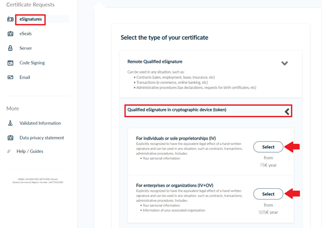 Once you log in, from the side bar, click eSignatures. Then, choose Qualified eSignature in cryptographic device (token) and Select one of the following certificate types.
