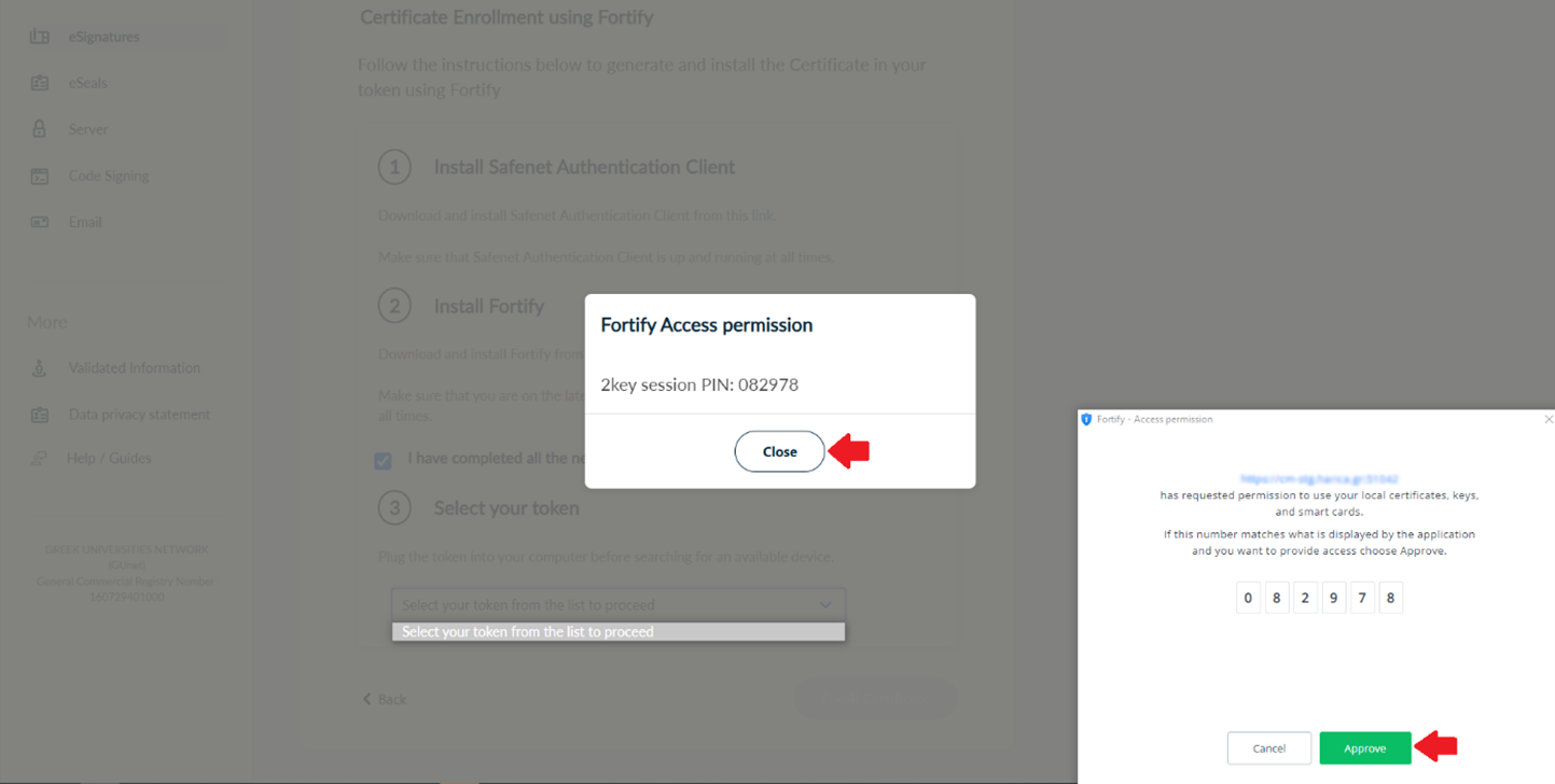 Once the token has been selected, you will need to grant access permission from the Fortify software. Two windows will appear on your screen, in which a PIN code is displayed. Make sure that the PIN code matches exactly in both windows and then click successively Approve and Close.