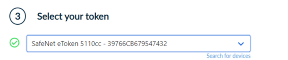 If the process is completed successfully, a green indicator will appear next to the search bar, showing the model of your token as well as its serial number.