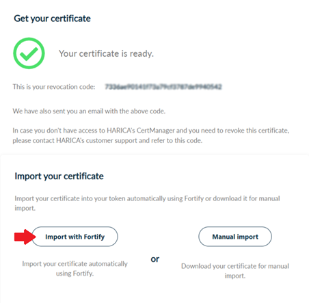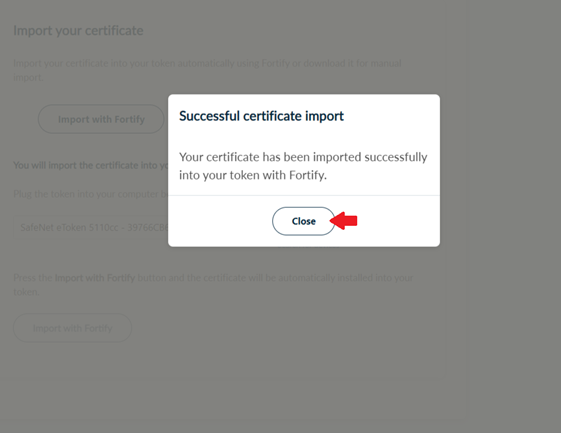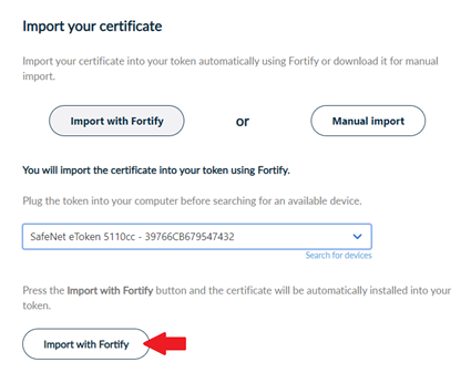 To import your certificate into the cryptographic device (token), select Import with Fortify.