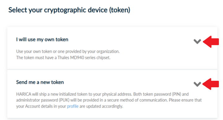 Select if you will use your own cryptographic device (token) or one provided by HARICA.