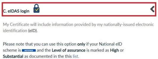 - Choose eIDAS login if your National eID scheme is NOTIFIED and the Level of assurance is marked as High or Substantial as documented in this list.