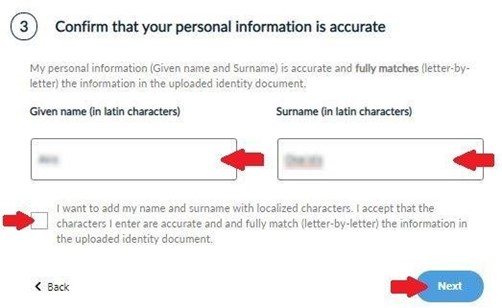 You have to make sure that your given name and surname are accurate and fully matched (letter-by- letter) with the information of the uploaded identification document in latin characters. In case they don’t match, please proceed to the appropriate corrections. Optionally, you may choose to add your name and surname with localized characters. Then, click Next.