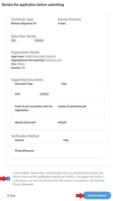 Check to make sure that all of the information is correct, accept the Terms of Use, the Certification Practices of HARICA and the Data Privacy Statement. Then, submit your request.