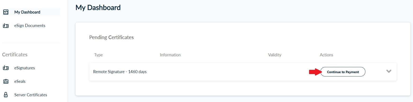 Once the request has been submitted successfully, the next step is to proceed to the payment of your remote eSignature. To do that, click Continue to Payment.