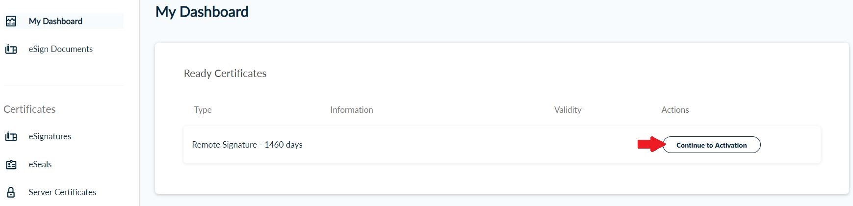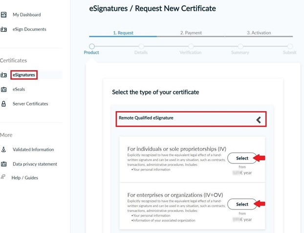 Once you log in, from the side bar, click eSignatures. Then, choose Remote Qualified eSignature and click Select to one of the following certificate types.