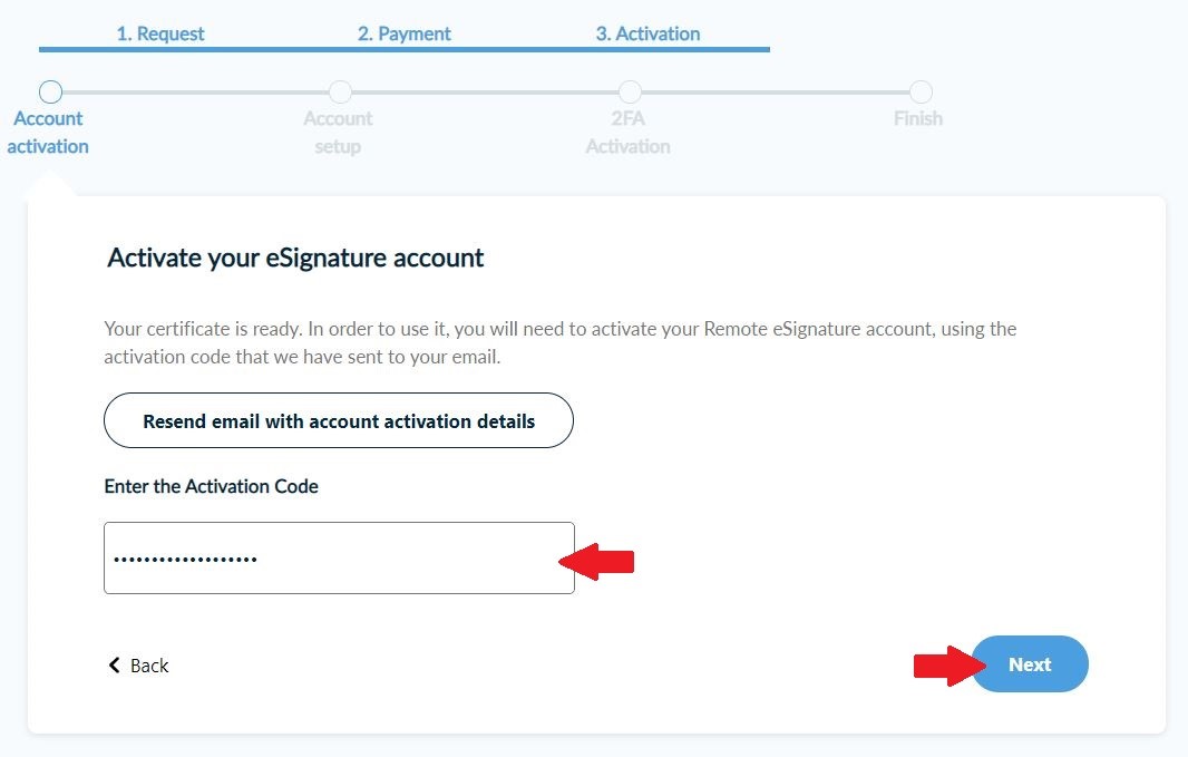 Enter the activation code you received by email. Then, click Next