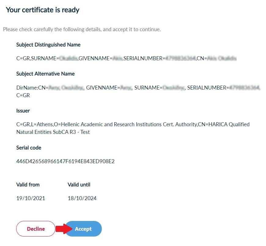 Check the information that will be included in the Certificate. If everything is correct, click Accept.