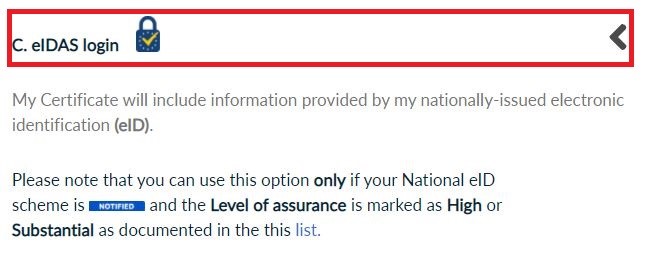- Choose eIDAS login if your National eID scheme is NOTIFIED and the Level of assurance is marked as High or Substantial as documented in this list.