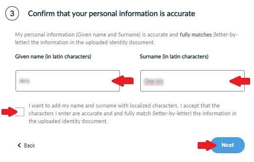 You have to make sure that your given name and surname are accurate and fully matched (letter-by-letter) with the information of the uploaded identification document in latin characters. In case they don’t match, please proceed to the appropriate corrections. Optionally, you may choose to add your name and surname with localized characters. Then, click Next.