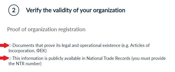 Verify the validity of your organization either by uploading all the required documents that prove its legal and operational existence (such as Articles of Incorporation, ΦΕΚ) or by providing the National Trade Records (NTR) number if this information is available in public records.