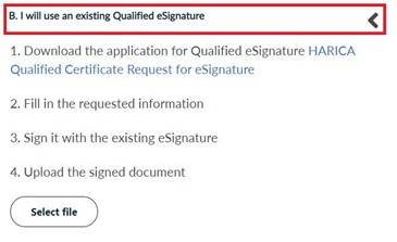 In case you choose method B, fill in and digitally sign HARICA’s request form with an existing qualified eSignature (e.g. eToken, smartcard).